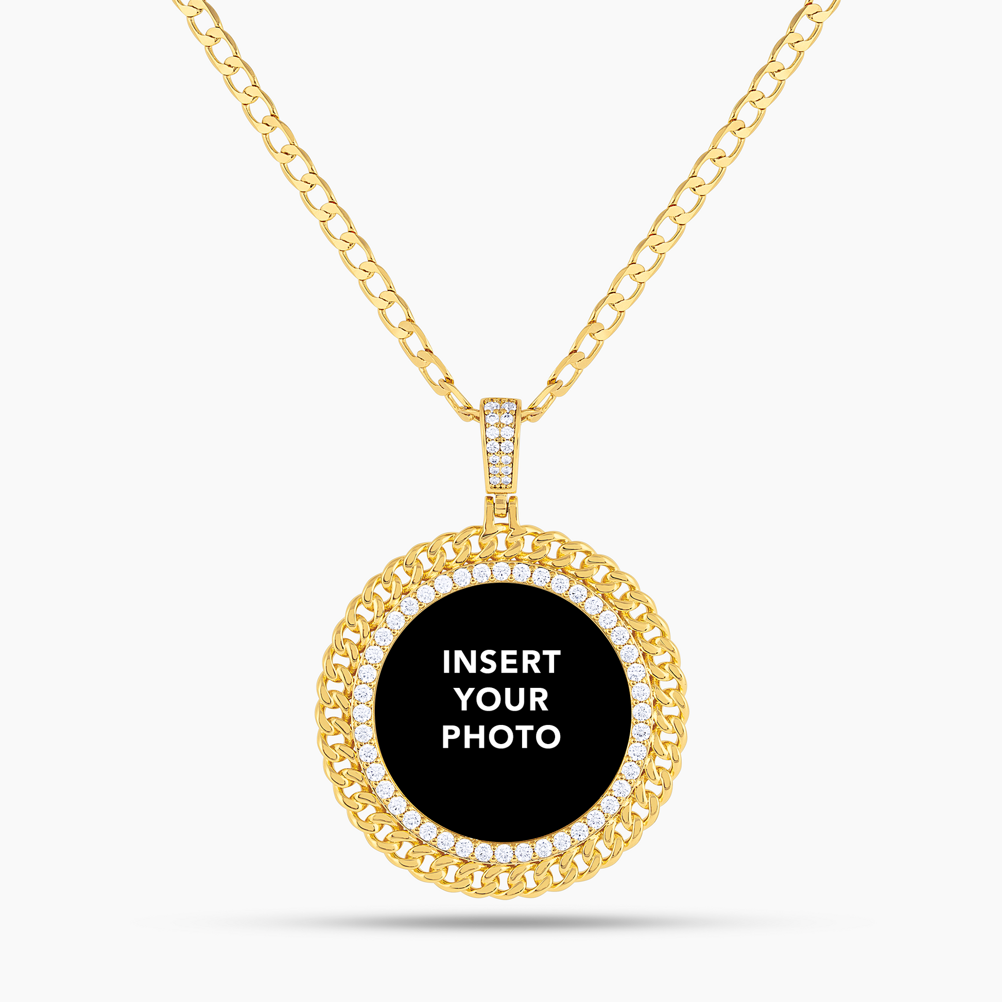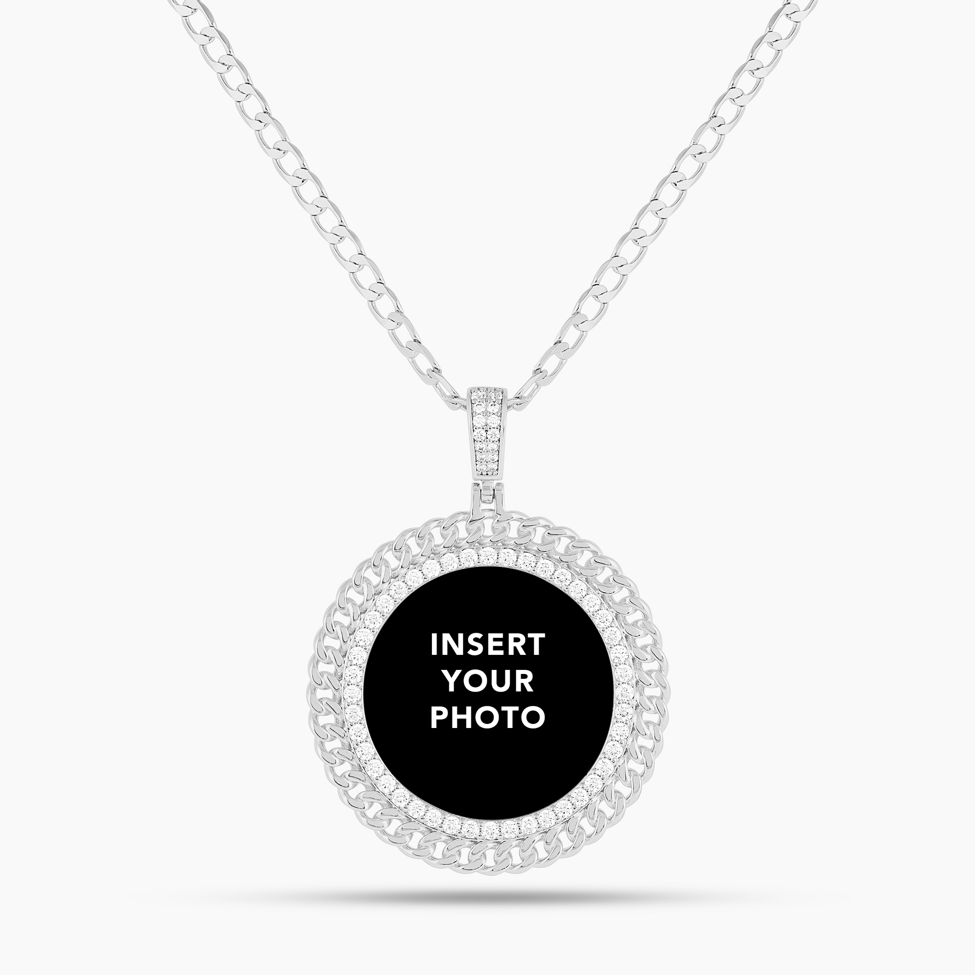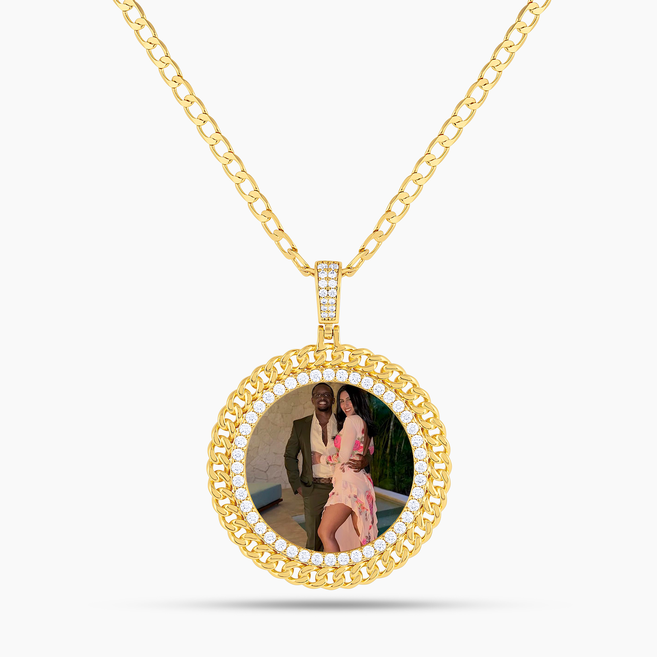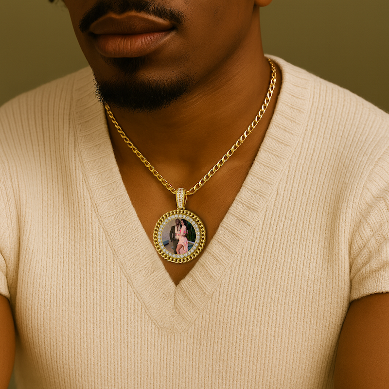 This Cuban Medallion Photo Pendant features a sleek circle design framed by a bold Cuban chain border, blending classic style with a personal touch. Perfect for showcasing your favorite photo, it adds a distinctive and elegant statement to any outfit. Durable and stylish, it’s a meaningful gift or a unique keepsake.