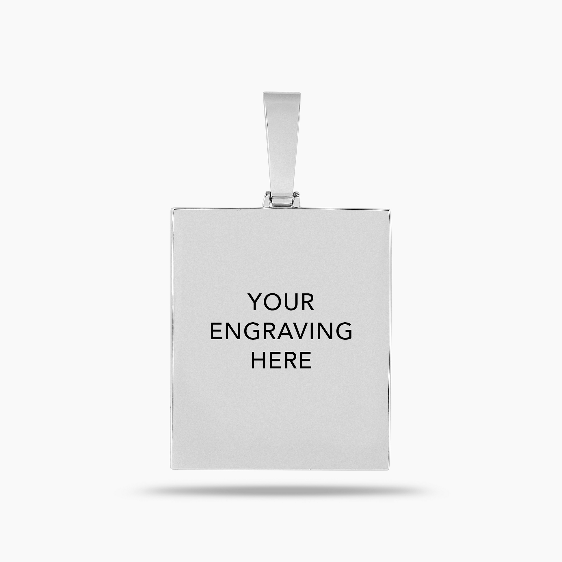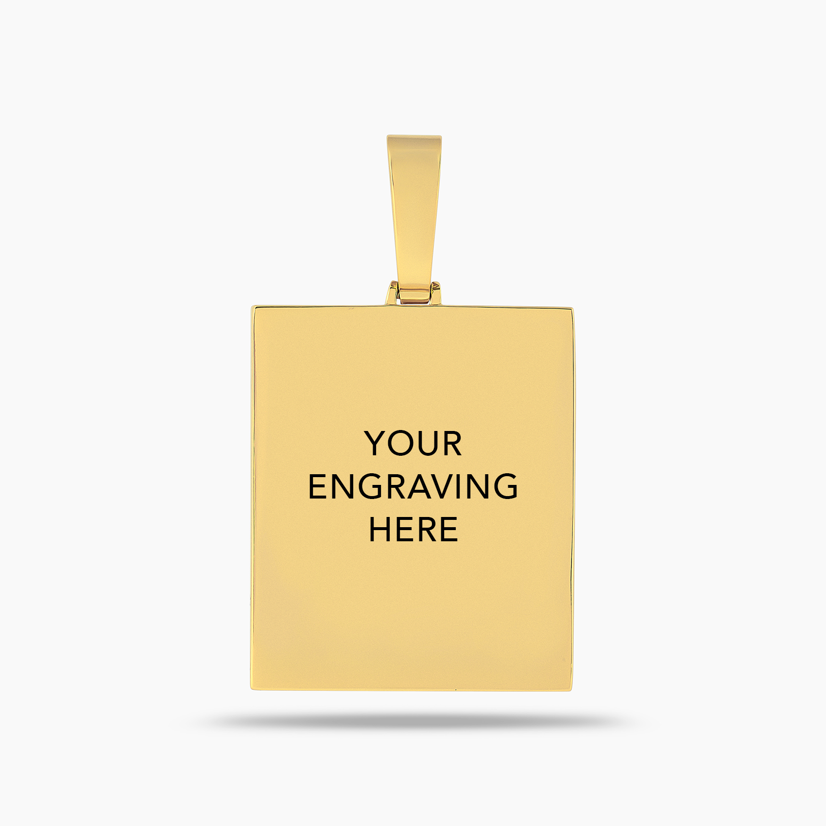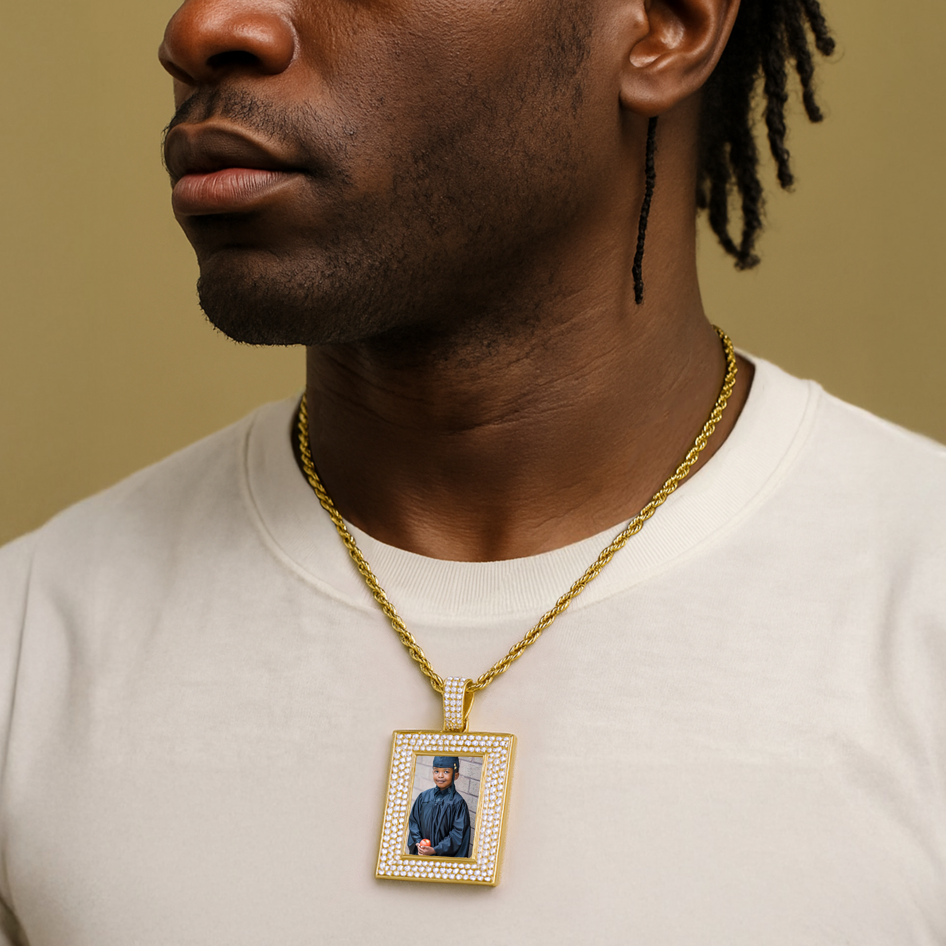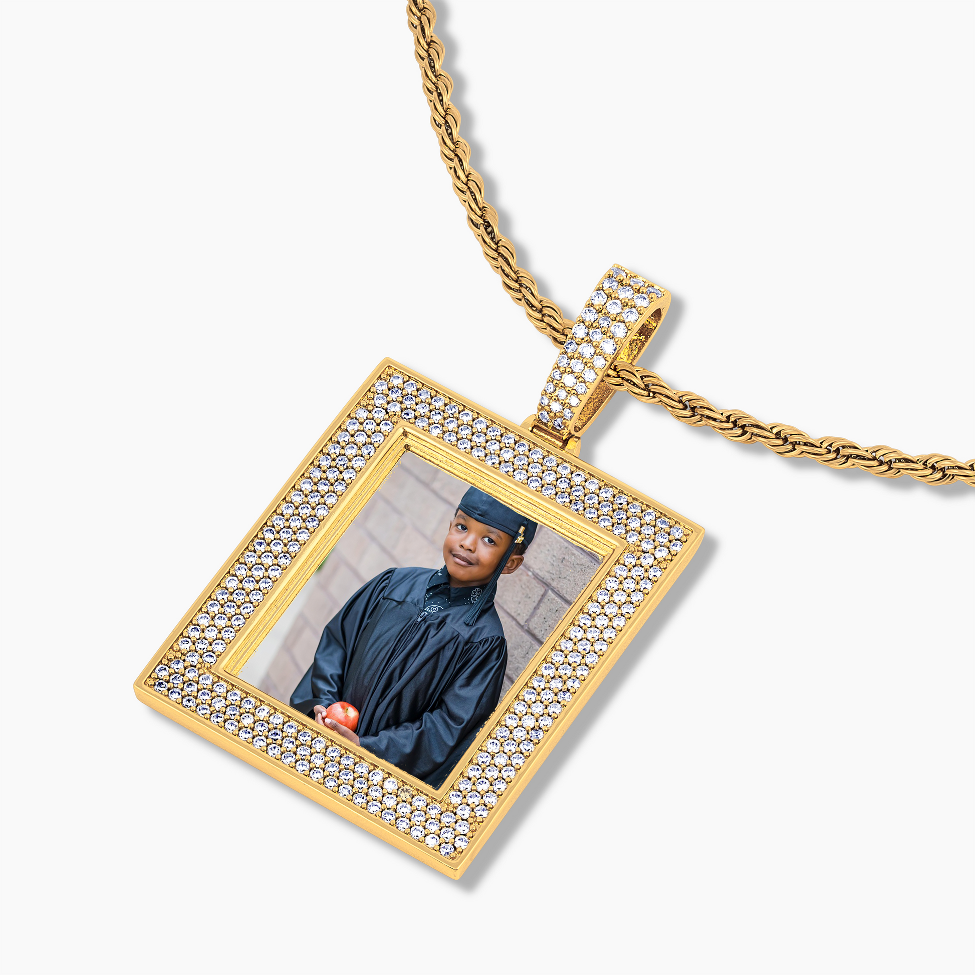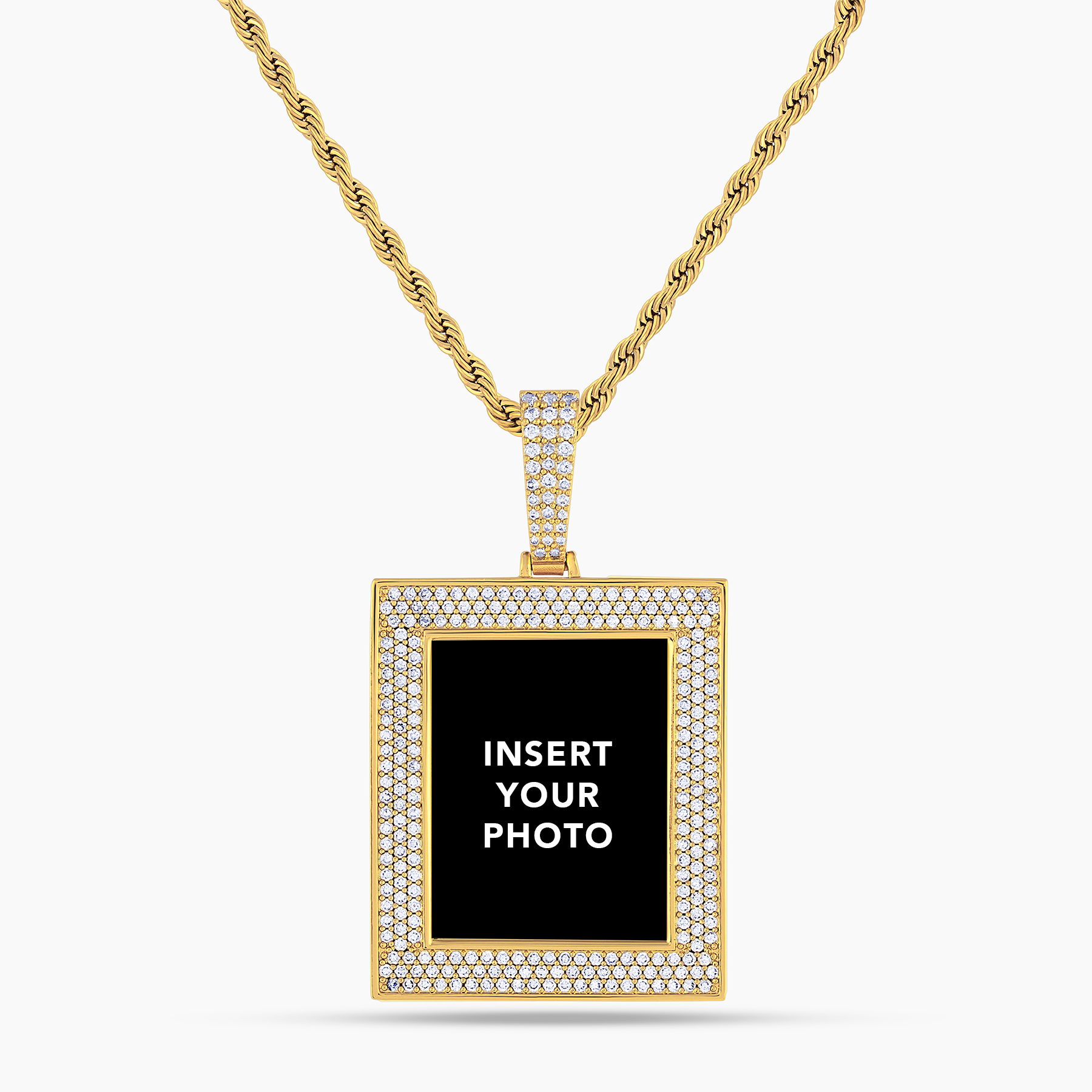 The Iced Picture Frame Photo Pendant puts your photo front and center in a bold square design, framed with rows of shimmering cubic zirconia. A clean, iced-out look that’s built to shine while keeping your memory close.