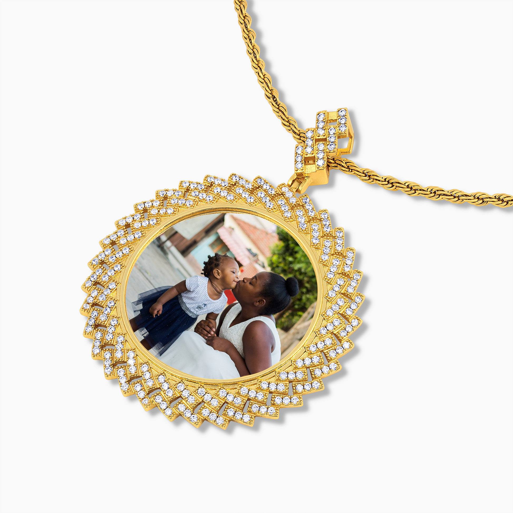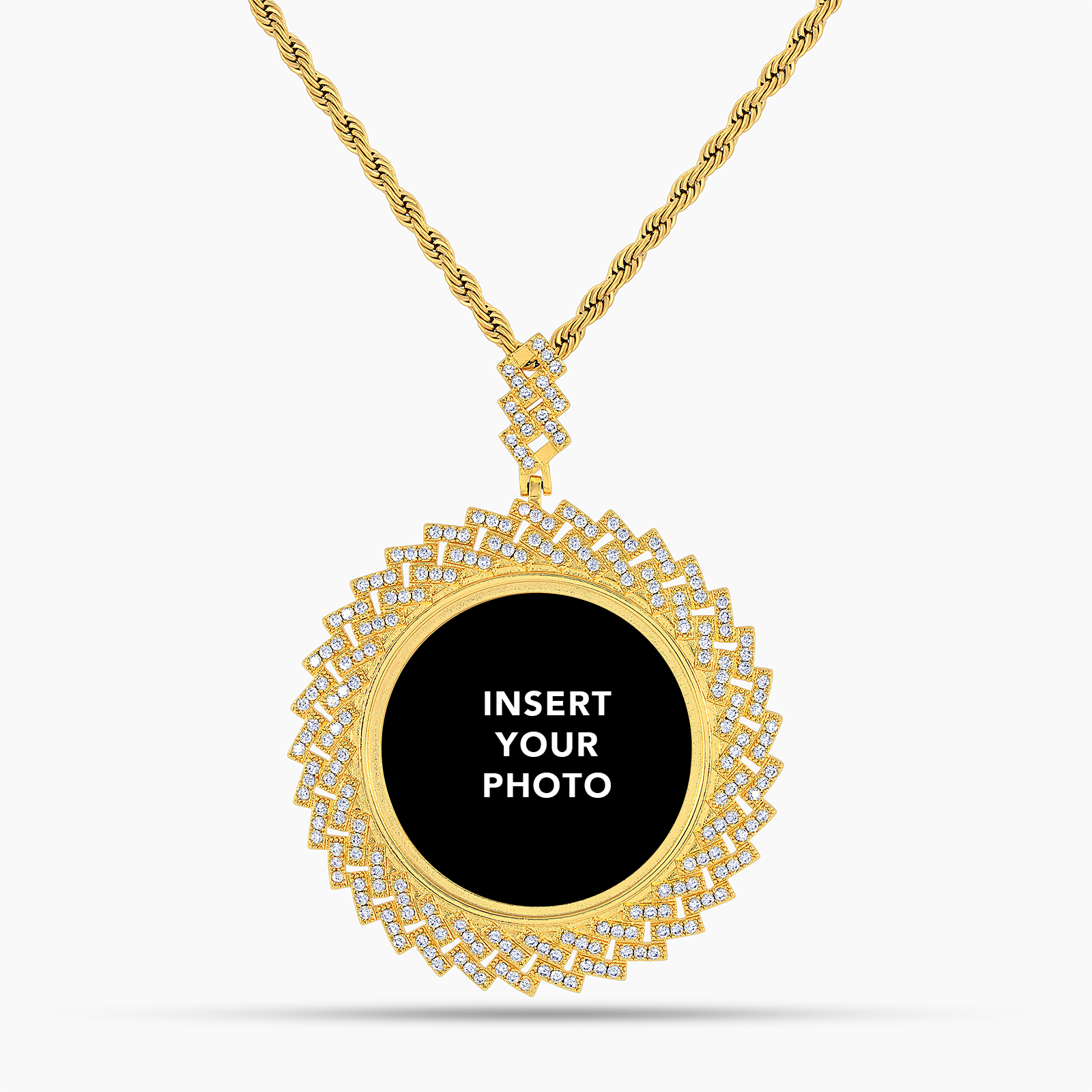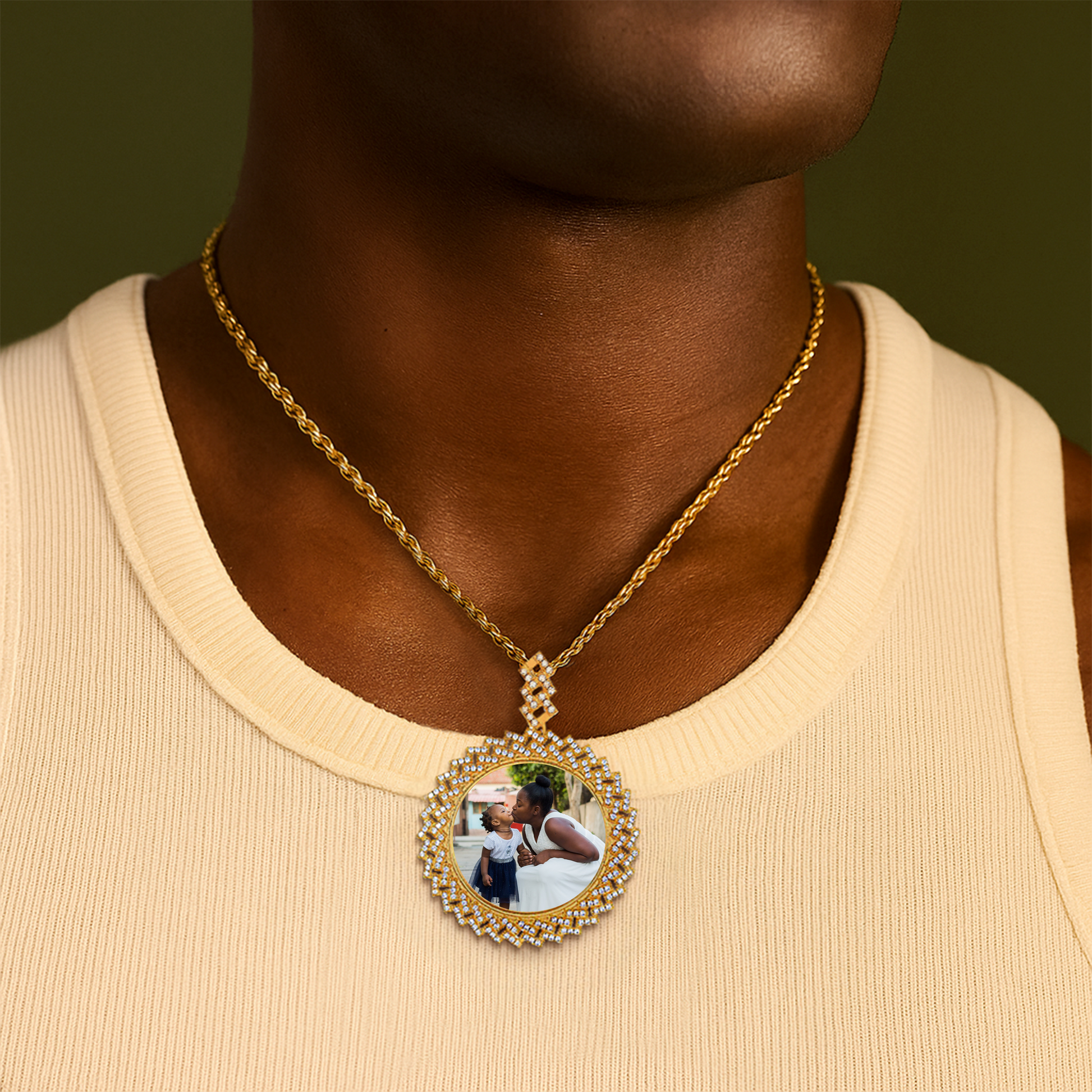 All shine, all love. The Iced Crown Medallion Photo Pendant puts your photo at the center of a bold round frame, stacked with layers of sparkling cubic zirconia for a true iced-out finish. It’s got the look of a statement piece with the heart of something personal — designed to flex your style and your story.