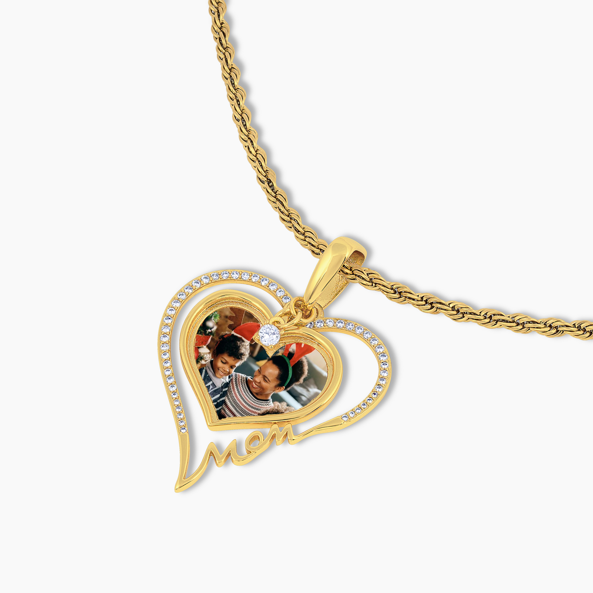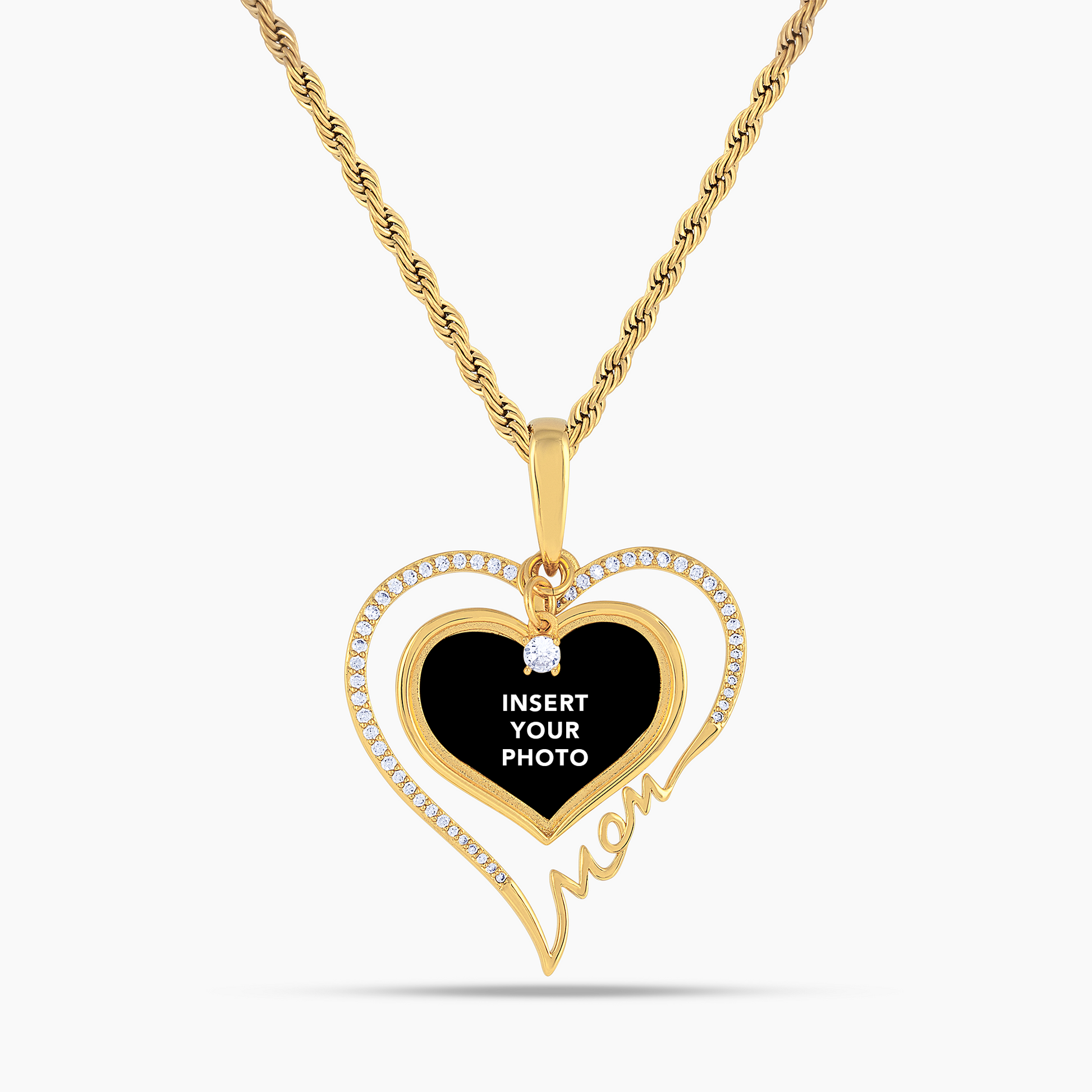 A tribute to the most important woman in your life. The Momma’s Love Photo Pendant frames your picture inside a golden heart, accented with cubic zirconia and finished with a bold “Mom” script. It’s got the shine of an iced-out piece and the heart of family love — made to celebrate Mom every day.