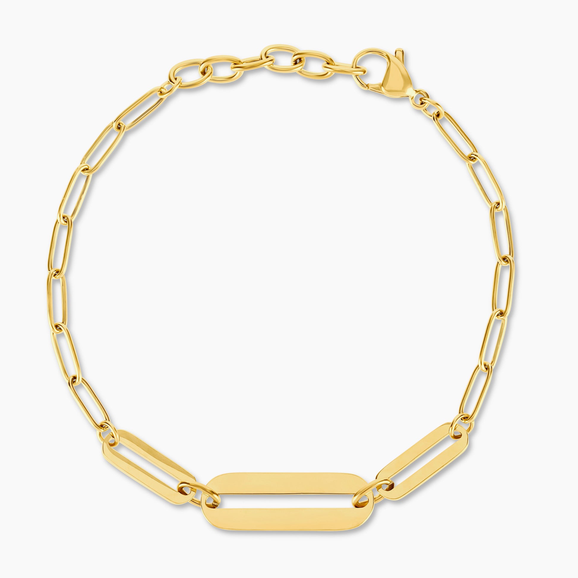 The Sleek Bar Paperclip Bracelet combines sleek style with contemporary edge, featuring three central elongated cylinder links. Durable and sophisticated, it’s ideal for any occasion.